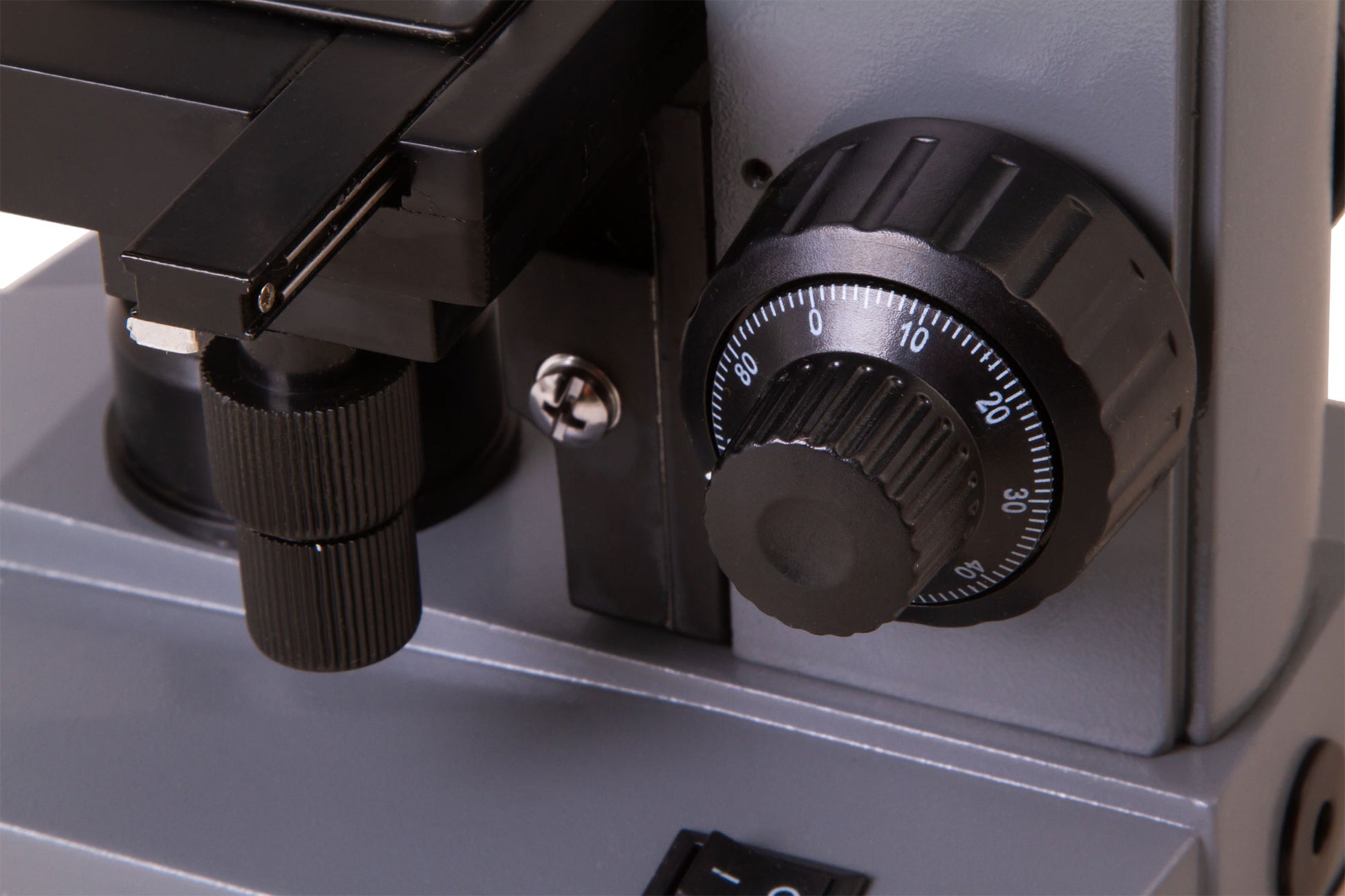 To adjust the sharpness, a coaxial mechanism of coarse and fine focusing adjustment is used. A stage can be moved along two axes. It is equipped with a mechanical scale. Under the stage, there is an Abbe condenser with iris diaphragm and LED illumination with adjustable brightness. The illumination can be powered by an AC supply as well as by batteries.
